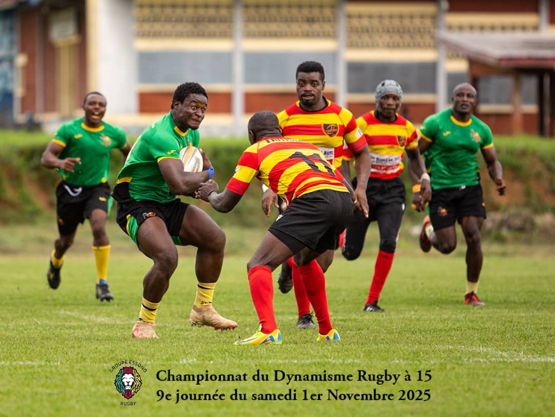 Deux affiches messieurs au menu de la 9e journée du championnat du dynamisme de rugby à 15(top 8 seniors messieurs) et une affiche (top 4 seniors dames) organisé par le Groupe Essono rugby Cameroon, ce 1 er novembre 2025. Sur la pelouse du collège Stoll d’Akono, AS Lions a pris le meilleur face à Espoirs (12-10), tandis que AS Massoda s’est imposé (55-20) face à Gorilles d’Ebolowa. Chez les dames, en guise de match de la 5e journée Honey a lourdement été battue par Eagles (41-03).
