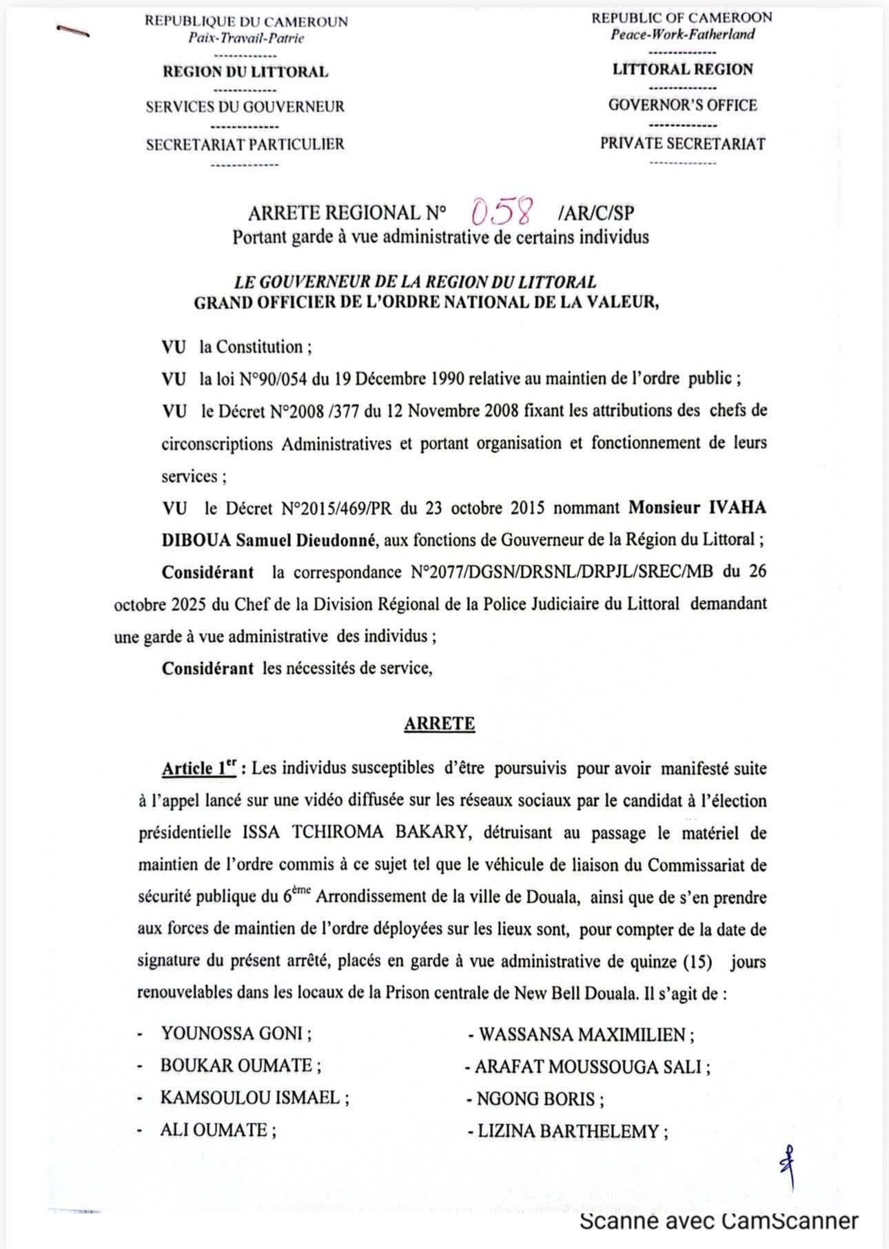 Un arrêté du gouverner de la région du Littoral indique les noms de ces individus susceptibles d’être poursuivis pour avoir manifesté et détruit le matériel de maintien de l’ordre.