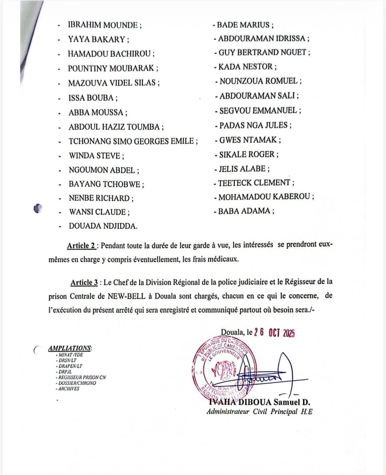 Le gouverneur de la région du Littoral, Samuel Dieudonné Ivaha Diboua a décidé dans un arrêté en date du 26 octobre, de placer 105 personnes en garde à vue administrative à Douala. Les intéressés vont séjourner à la prison centrale de New Bell pendant 15 jours renouvelables. Et vont assurer eux-mêmes leur prise en charge ainsi que leur frais médicaux éventuels.
